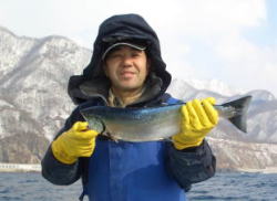 | 平成19年1月28日 苫小牧沖のマス釣り。第3北斗丸によると船中14匹、日によってバラツキが有る様です。それでもあれだけうるさかったスケソウがそろそろ減ってきたのでこれからという事の様です。 |