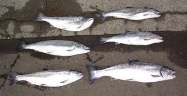 | 平成19年1月23日 苫小牧沖のマス釣り。16日頃からボツボツ釣れ始めたとの情報で行って来ました。結果的に大した事無かったが今後に期待出来る。6名で2.3kg頭に17匹 |