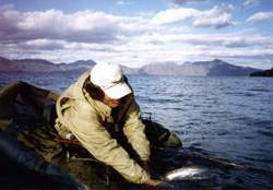 H17/5/31支笏湖にて ハンドメイドルアーの製作者安藤氏 ブラウン74cm レッドコアーのトローリングにて |